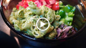 2. In a thick bottomed pan pour oil, add dry herbs, cinnamon stick, add chopped cubed, vegetables mix in, add penne pasta, green chilies, roughly chopped greens, add water, cook for two whistles.